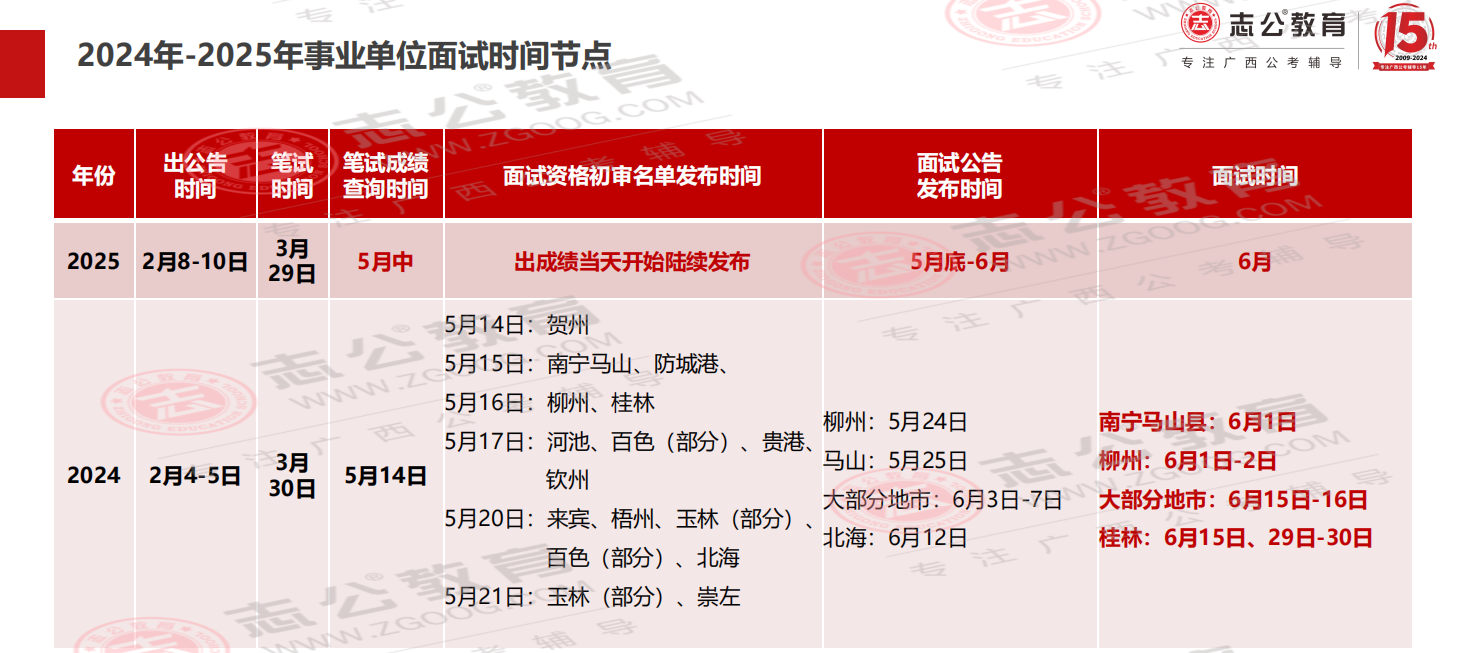 2024年廣西事業(yè)單位3月30日筆試,5月14日成績(jī)發(fā)布,最早6月1日面試,出名單到面試間隔僅2周時(shí)間備考;2025年3月29日筆試,考試周期和去年基本重合,大家可以參考去年時(shí)間,提前備考面試。