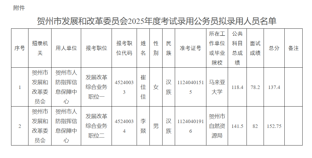 附件:賀州市發(fā)展和改革委員會(huì)2025年度考試錄用公務(wù)員擬錄用人員名單